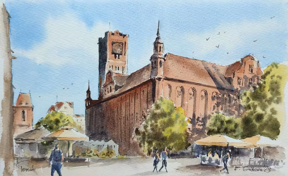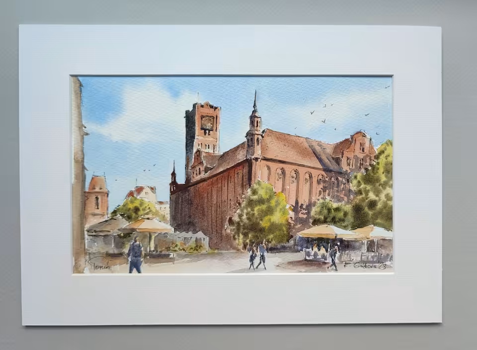 Akwarela na papierze, oprawiona w passe-partout A4 w jasnym kolorze.