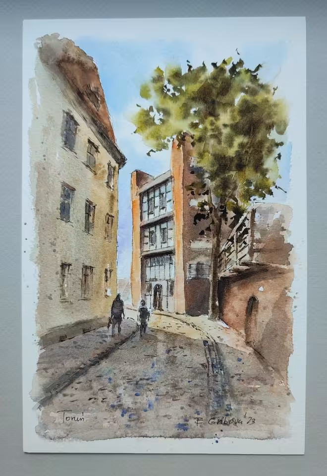 Akwarela na papierze, oprawiona w passe-partout A4 w jasnym kolorze.