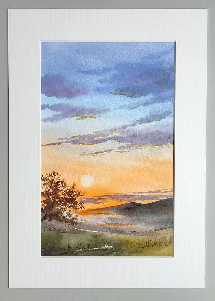 Akwarela namalowana na papierze akwarelowym, oprawiona w passe-partout A4 w jasnym kolorze.
