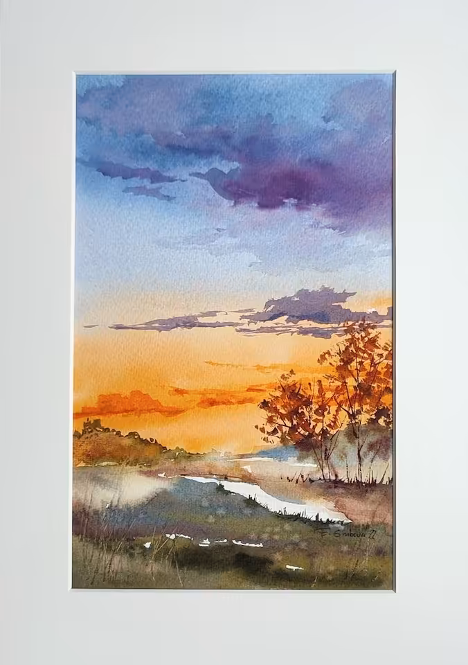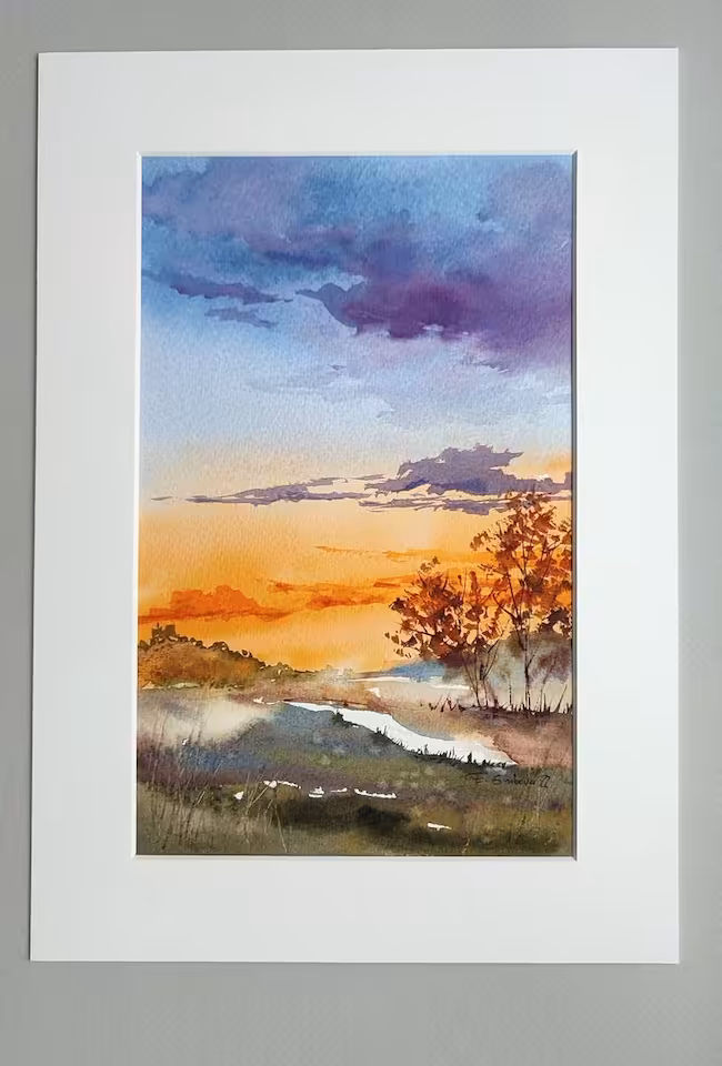 Akwarela na papierze, oprawiona w passe-partout A4 w jasnym kolorze.