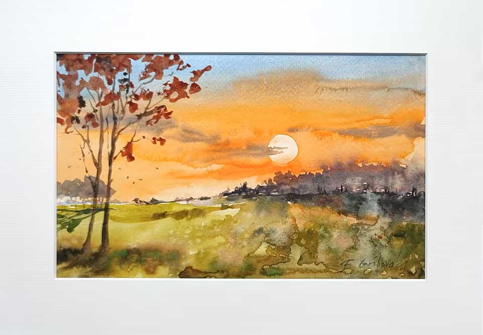 Akwarela na papierze, oprawiona w passe-partout A4 w jasnym kolorze.